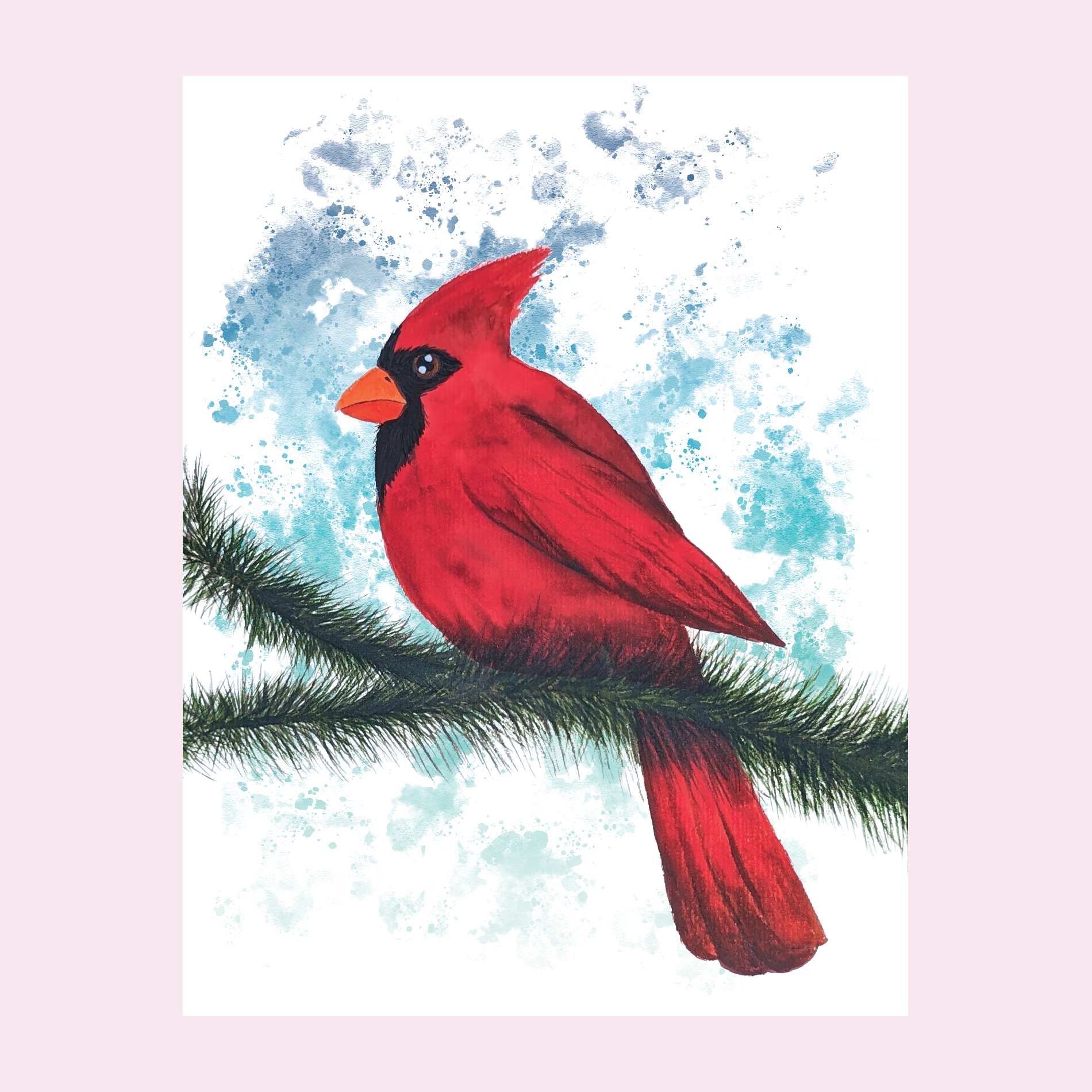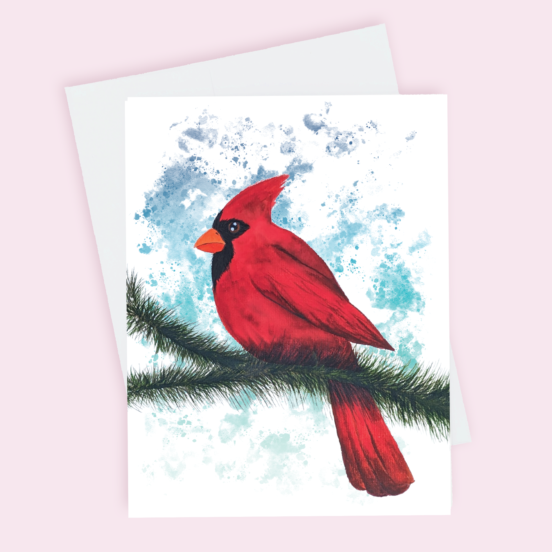 This festive Evergreen Cardinal greeting card showcases a bright red cardinal perched on a lush evergreen branch, capturing the spirit of the season. This wintry scene brings a classic touch of holiday tradition to seasonal notes.