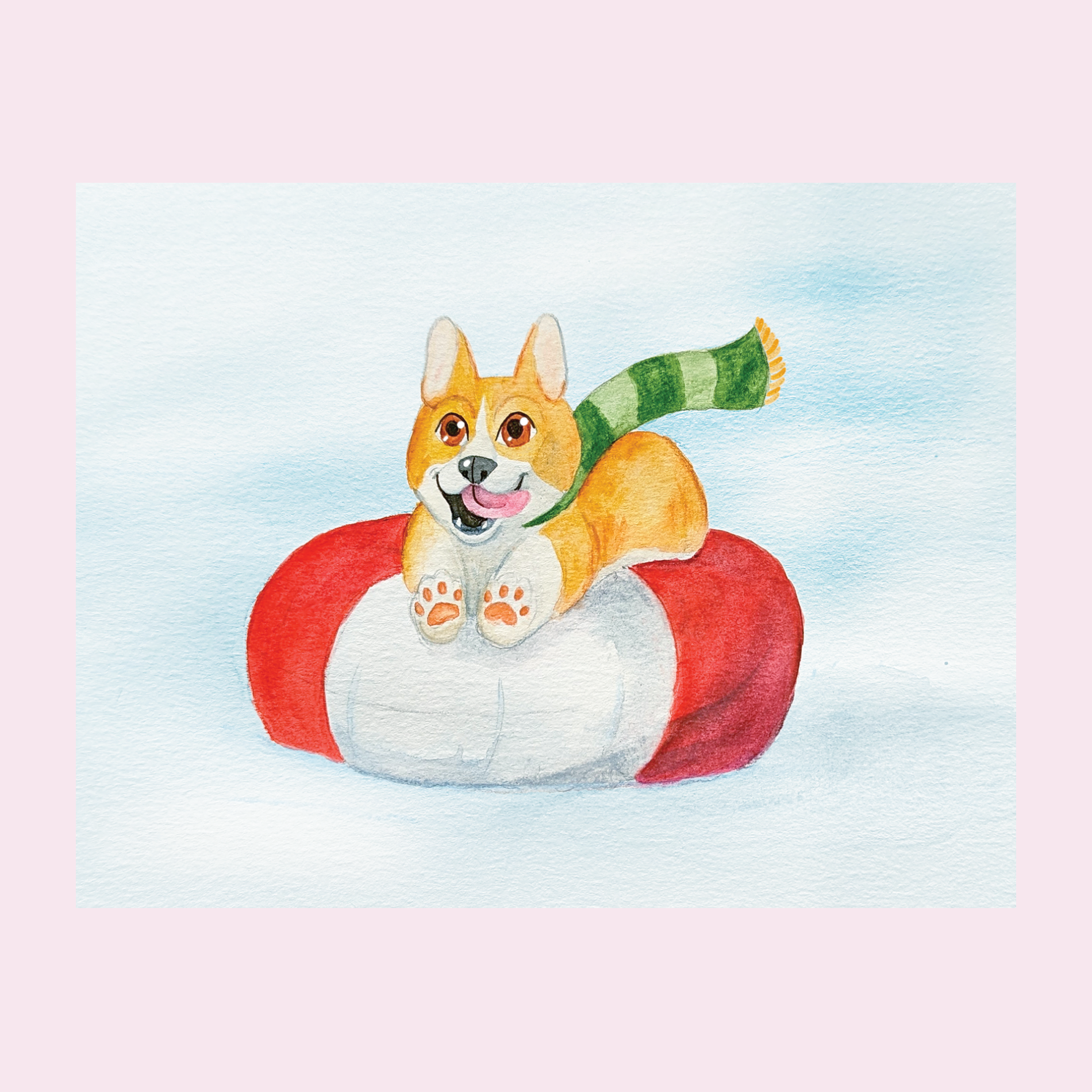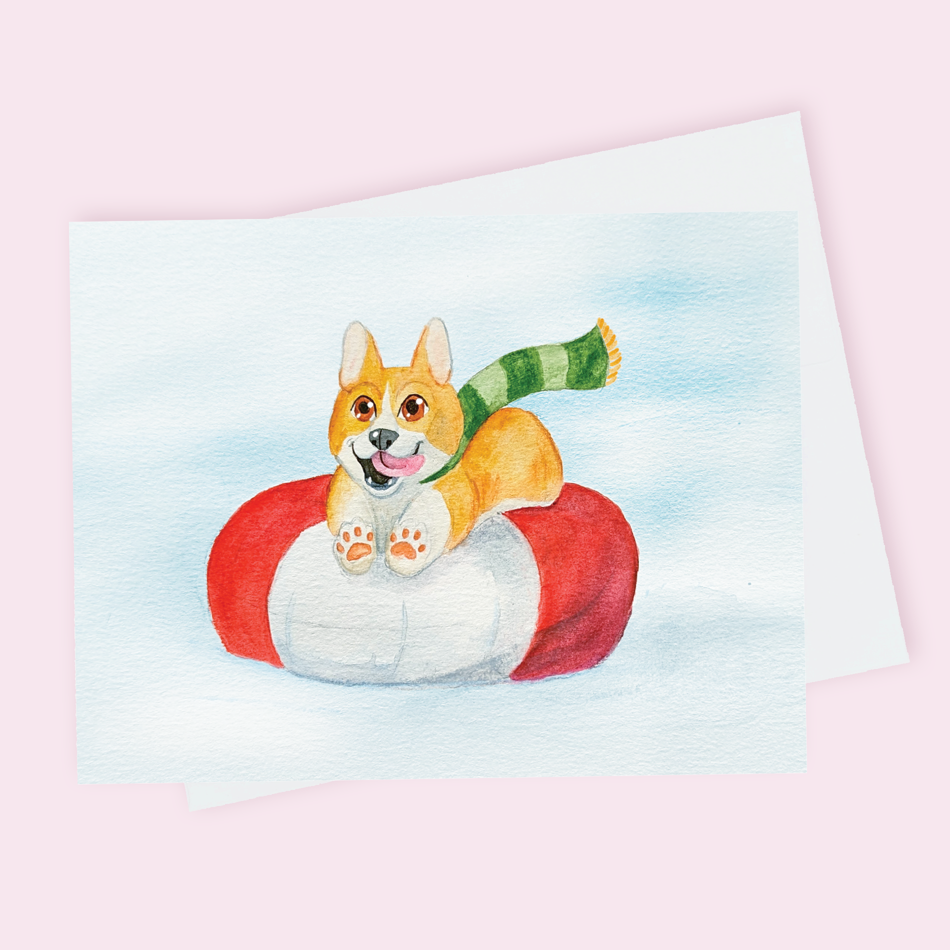 This playful Sledding Corgi holiday card features a charming painted corgi joyfully riding an inner tube across the snow, capturing the fun and spirit of the season. Perfect for spreading holiday cheer, it adds a whimsical and heartwarming touch to your festive greetings.